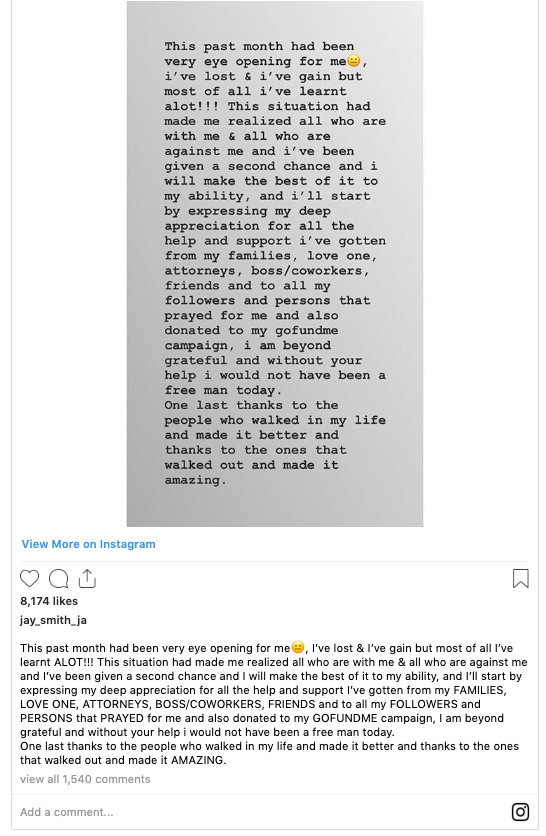 After his release, Jay took to Instagram to share thoughts on his experience and current mindset. “This past month had been very eye opening for me?, I’ve lost & I’ve gain but most of all I’ve learnt ALOT!!! This situation had made me realized all who are with me & all who are against me and I’ve been given a second chance and I will make the best of it to my ability, and I’ll start by expressing my deep appreciation for all the help and support I’ve gotten from my FAMILIES, LOVE ONE, ATTORNEYS, BOSS/COWORKERS, FRIENDS and to all my FOLLOWERS and PERSONS that PRAYED for me and also donated to my GOFUNDME campaign, I am beyond grateful and without your help i would not have been a free man today. One last thanks to the people who walked in my life and made it better and thanks to the ones that walked out and made it AMAZING.” He wrote on Instagram.