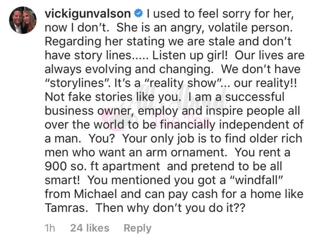 “You rent a 900 sq. ft apartment and pretend to be all smart!” Vicki added. “You mentioned you got a ‘windfall’ from Michael and can pay cash for a home like Tamras. Then why don’t you do it??”