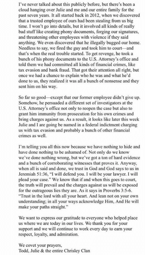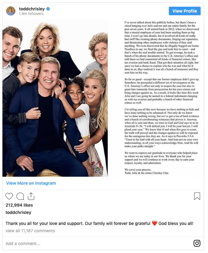 On Monday, Todd Chrisley took to Instagram to address the looming charges in a lengthy post. He denied the accusations on behalf of his family, saying they were set up by a disgruntled employee.