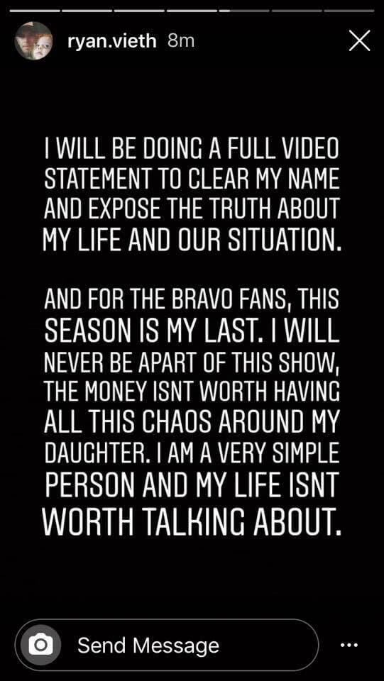 Ryan wrote that he wanted to “set the record straight” — posting a written response to the text controversy on his Instagram story. Ryan promised a “full video statement” in order to clear his name, and vowed that this season of RHOC would be his last.