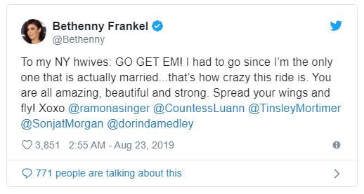 “To my NY hwives: GO GET EM! I had to go since I’m the only one that is actually married…that’s how crazy this ride is,” the former Real Housewives of New York City star tweeted in the early hours of Friday, August 23. “You are all amazing, beautiful and strong. Spread your wings and fly! Xoxo @ramonasinger @CountessLuann @TinsleyMortimer @SonjatMorgan @dorindamedley.”