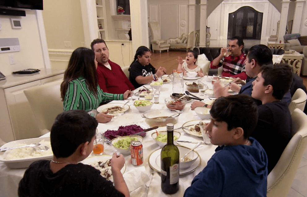 Over at Dolores Catania’s house, Frankie is working out. Because he placed first in a bodybuilding competition last year, he’s now modeling part-time. And though Dolores claimed she was moving out of the house and into an apartment last season, she’s not going anywhere. She’s still shacking up with Frank, her ex-husband, and telling him how cute he looks in his gray t-shirt. And she’s still seeing her boyfriend, David, who joins her in the kitchen, sharing bro hugs with the two Franks.