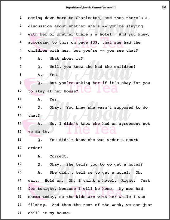 Joe Abruzzo responded that he wasn’t aware of the order and goes on to testify that Kathryn’s mother would watch the kids on the same day she received chemotherapy treatment.