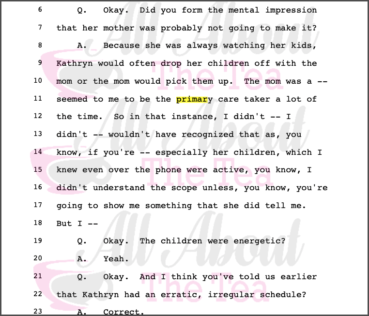 “Because she was always watching her kids, Kathryn would often drop her children off with the mom or the mom would pick them up.” Joe Abruzzo testified under oath. “The mom was a — seemed to me to be the primary care taker a lot of the time.”