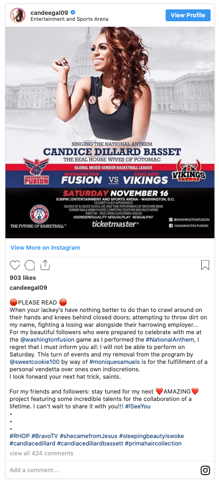 According to Candiace, she was “removed from the program,” because a woman she tagged in the post, who works for the Entertainment and Sports Arena, fulfilled “a personal vendetta over one’s own indiscretions” by listening to Monique and canceling Candiace’s performance.