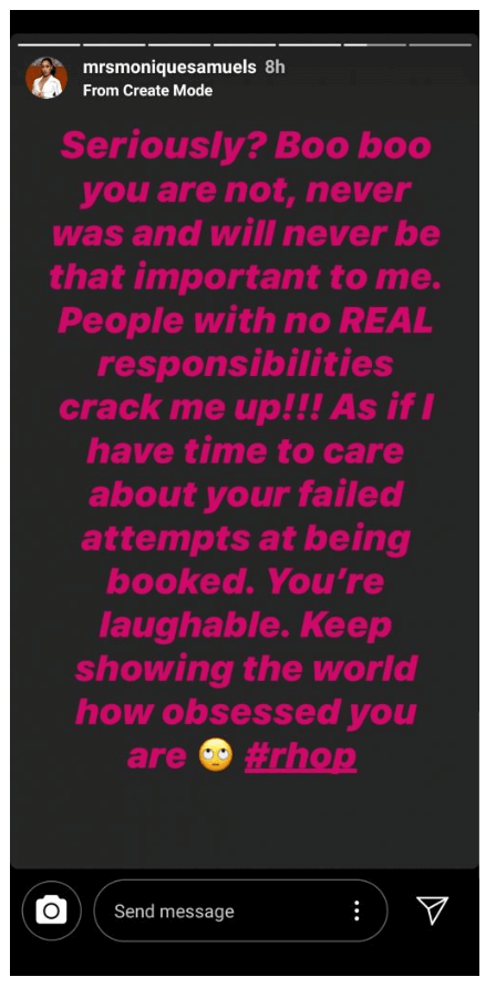 Monique quickly clapped back at Candiace’s latest claims on her Instagram Story — Monique says Candiace “is not, never was, and never will be that important to me.” She added, Candiace has “no real responsibilities” and asserted she doesn’t care about the singer’s “failed attempts at being booked.”