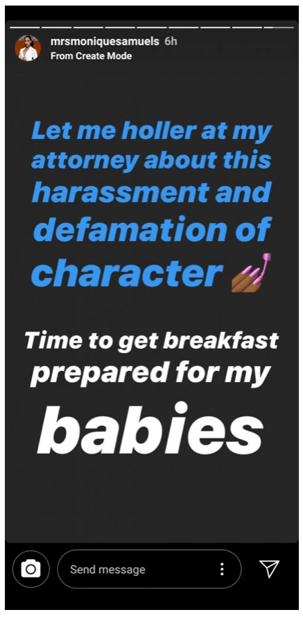 Monique concluded her response by saying she will “holler” at her attorney “about this harassment and defamation of character.”