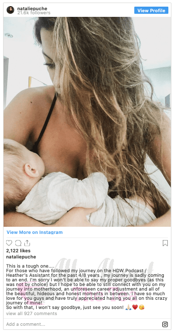 “This is a tough one….For those who have followed my journey on the HDW Podcast / Heather’s Assistant for the past 4/8 years , my journey is sadly coming to an end. I’m sorry I won’t be able to say my proper goodbyes (as this was not by choice) but I hope to be able to still connect with you on my journey into motherhood, an unforeseen career adjustment and all of the beautiful, hideous and honest moments in between. I have so much love for you guys and have truly appreciated having you all on this crazy journey of mine!