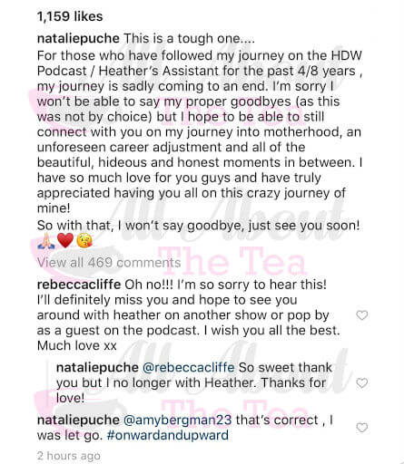 Natalie Puche took to Instagram on Wednesday and announced that she had been let go, “This is a tough one….For those who have followed my journey on the HDW Podcast / Heather’s Assistant for the past 4/8 years , my journey is sadly coming to an end. I’m sorry I won’t be able to say my proper goodbyes (as this was not by choice) but I hope to be able to still connect with you on my journey into motherhood, an unforeseen career adjustment and all of the beautiful, hideous and honest moments in between. I have so much love for you guys and have truly appreciated having you all on this crazy journey of mine! So with that, I won’t say goodbye, just see you soon! ??♥️?.”