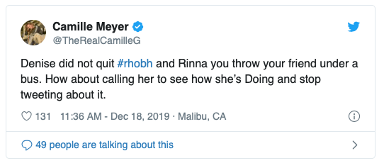 Camille Grammer, 51, who has filmed several scenes for the upcoming 10th season, stepped into the fray and had Denise Richards’ back. “Denise did not quit #RHOBH and Rinna you throw your friend under a bus. How about calling her to see how she’s Doing and stop tweeting about it.” Camille tweeted on December 18.