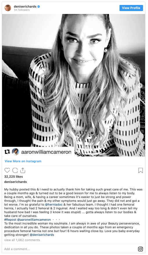 “My hubby posted this & I need to actually thank him for taking such great care of me. This was a couple months ago & turned out to be a good lesson for me to always listen to my body,” Denise wrote alongside a series of photos from her stint in the hospital, which her husband, Aaron Phypers, first shared. “Being a mom, wife, & having a career sometimes it’s easier to just be strong and power through, I thought the pain & my other symptoms would just go away. They did not and got a lot worse. I’m so grateful to @herniadoc & her fabulous team. I thought I had one femoral hernia, I actually had 2 femoral & 2 inguinal. And I waited way too long & didn’t even tell my husband how bad I was feeling (I know it was stupid) … gotta always listen to our bodies & take care of ourselves.”
