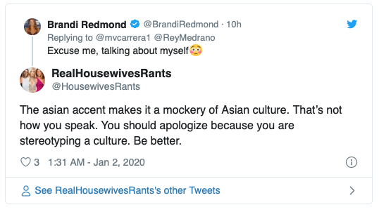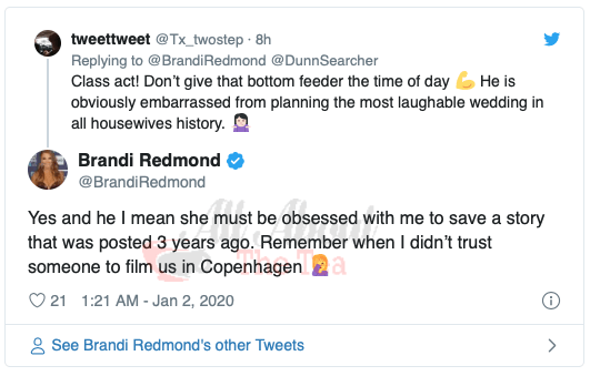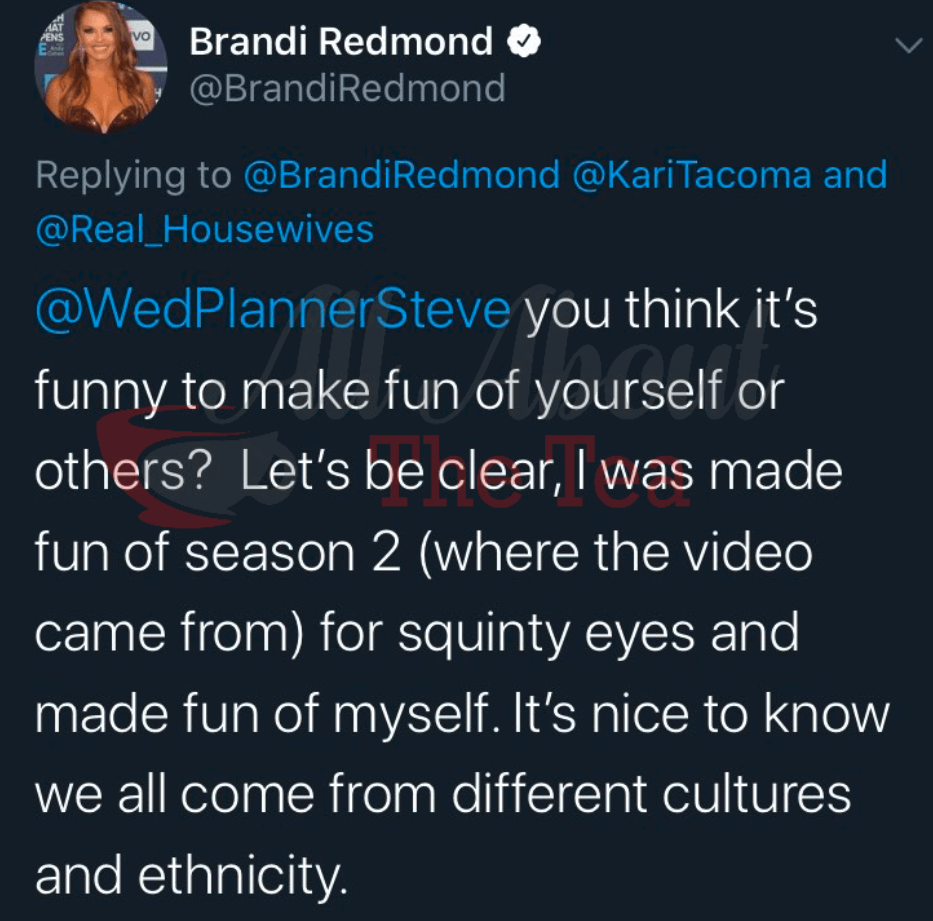Brandi Redmond blasted LeeAnne Locken’s wedding planner in a now-deleted tweet, “you think it’s funny to make fun of yourself or others? Let’s be clear, I was made fun of season 2 (where the video came from) for squinty eyes and made fun of myself. It’s nice to know we all come from different cultures and ethnicity.” she wrote on January 2.