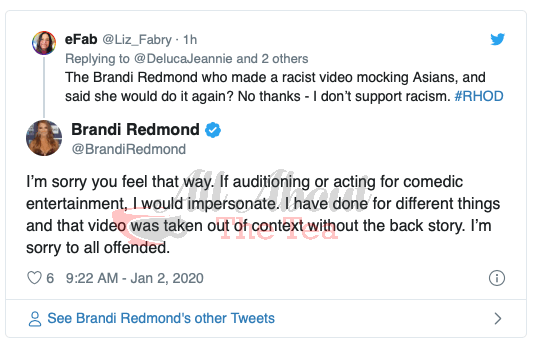 The video sent shock waves through social media and the savage backlash prompted Brandi Redmond to issue somewhat of an apology. “I’m sorry you feel that way. If auditioning or acting for comedic entertainment, I would impersonate. I have done for different things and that video was taken out of context without the back story. I’m sorry to all offended.” the mom of three tweeted a fan on January 2.