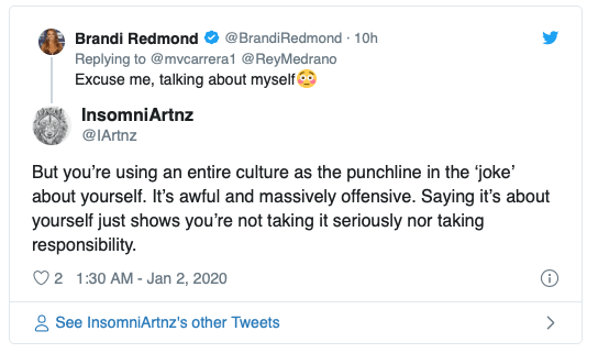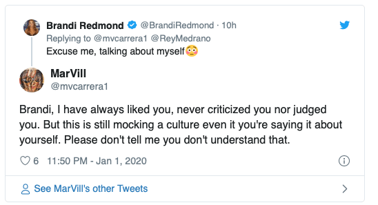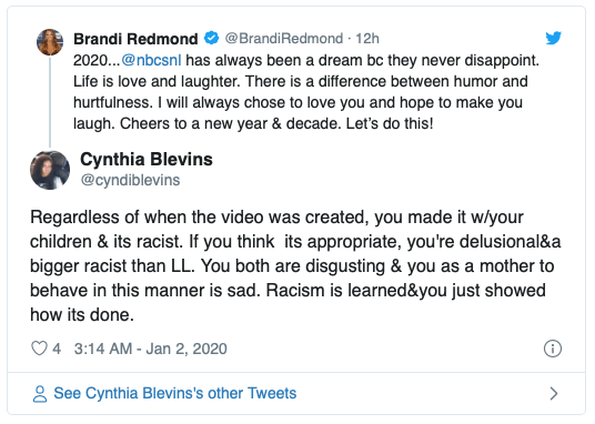 To make matters worse, Brandi Redmond tweeted SNL and labeled her culturally inappropriate skit as “humor” she wrote, “2020…@nbcsnl has always been a dream bc they never disappoint. Life is love and laughter. There is a difference between humor and hurtfulness. I will always chose to love you and hope to make you laugh. Cheers to a new year & decade. Let’s do this!” She tweeted on Wednesday night.