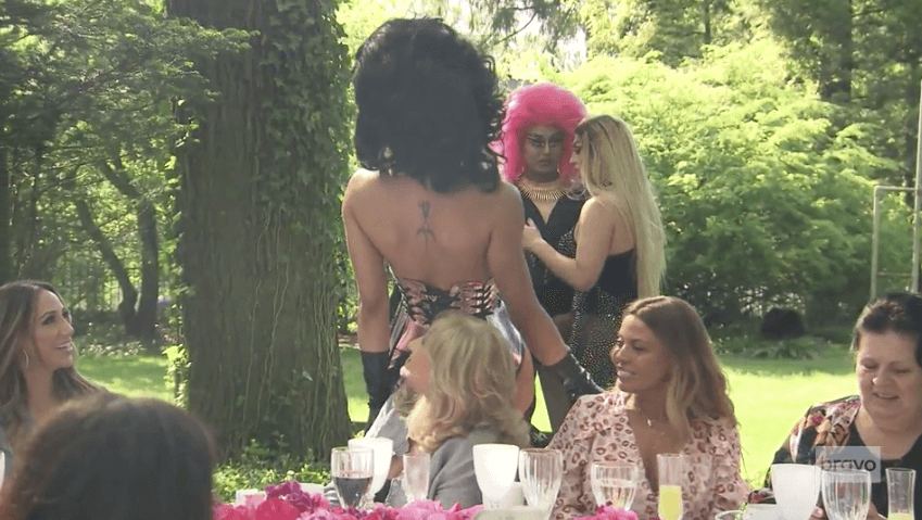 At Margaret Josephs’ house, her party planner, Amy, has provided a bar and an omelet station. Marge Sr. makes an appearance. And then the drag queens arrive, adding color to the day. Jackie and her mother, Ann, arrive first. They’re escorted to the back of the property by the queens. Jackie and her mom stop by next. Josephine is a little shocked at men dressed as women. Finally, Dolores and Melissa pop up on the scene, along with their mothers. They sit at the elaborate table and don rose-covered head pieces.