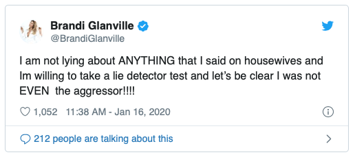 The Real Housewives of Beverly Hills alum tweeted the following message on January 16, “I am not lying about ANYTHING that I said on housewives and Im willing to take a lie detector test and let’s be clear I was not EVEN the aggressor!!!!”