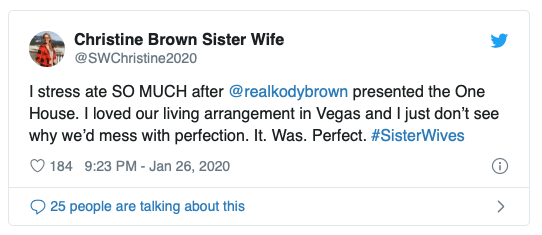 Christine Brown also shared that Kody’s one-house reveal caused her to stress eat and their Vegas homes were the perfect arrangement — she tweeted, “I stress ate SO MUCH after @realkodybrown presented the One House. I loved our living arrangement in Vegas and I just don’t see why we’d mess with perfection. It. Was. Perfect.”