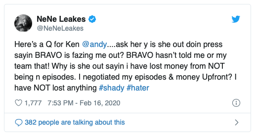 NeNe Leakes also thanked her boss for defending her, she tweeted: “I HAVE NOT been cut out of any episodes! I negotiated my episodes just like everyone else did! I’m getting every dime i asked for! Thank you for asking and clearing that up @andy That means a lot to me.”