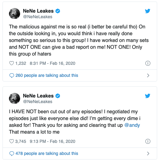 NeNe Leakes continued to vent on Twitter, writing, “The malicious against me is so real (i better be careful tho) On the outside looking in, you would think i have really done something so serious to this group! I have worked on many sets and NOT ONE can give a bad report on me! NOT ONE! Only this group of haters.”