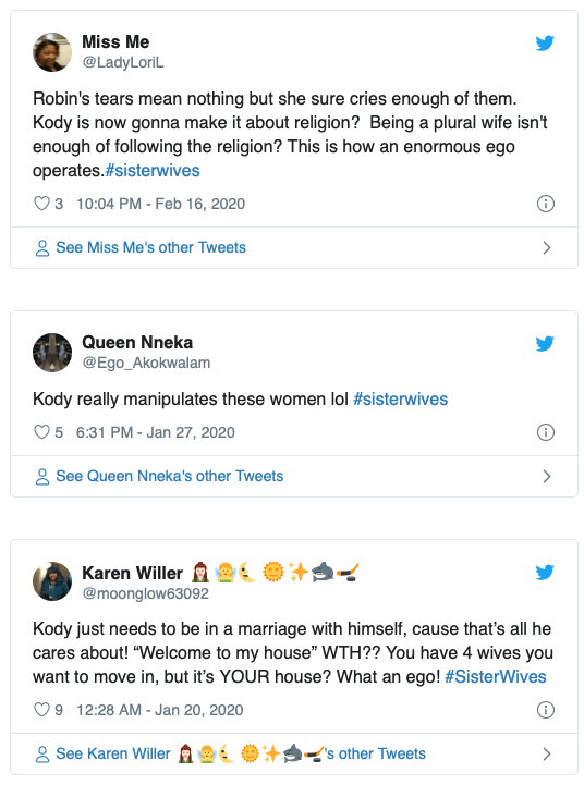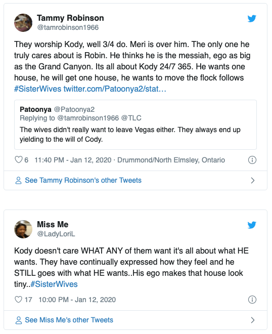 Viewers sounded off about Kody Brown’s over inflated ego and slammed the Sister Wives star for manipulating his four wives over his one dwelling plan.