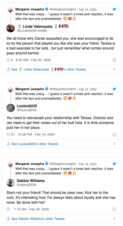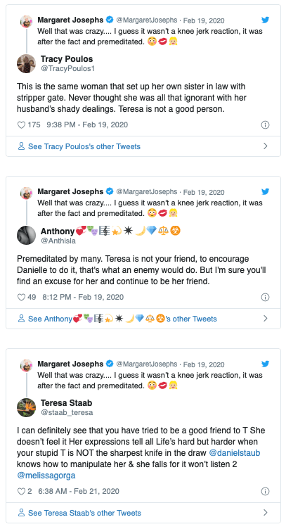 After the revelation was confirmed by footage, Margaret Josephs reacted to finding out that Teresa Giudice actually encouraged Danielle to assault her on Twitter. She wrote, “Well that was crazy…. I guess it wasn’t a knee jerk reaction, it was after the fact and premeditated.”