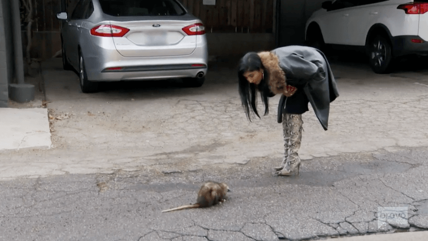 Destiney Rose has a flat tire. Her 1965 Lincoln is stuck on the side of the road. She feels vulnerable, and the only time she thinks about a husband is during situations like this. But as Destiney is talking on the phone and lamenting her single status, a pregnant opossum creeps up behind her. (It matches the fur on the collar of her coat, btw.) At first she’s scared, but then she gives it a pep talk. A stranger brings a towel and scoops it up before taking it back to the bushes where it lives. Whew. That opossum will live to fight another day.