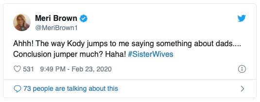 During the February 23 episode of Sister Wives, Meri Brown, 49, shared her two-cents on Janelle Brown, 50, finding out the sex of her daughter Maddie‘s baby before husband Kody — and that annoyed him. “And dads shouldn’t?” Kody said during the episode. Meri Brown took to Twitter to respond while the episode aired — she tweeted, “Ahhh! The way Kody jumps to me saying something about dads … Conclusion jumper much? Haha!”