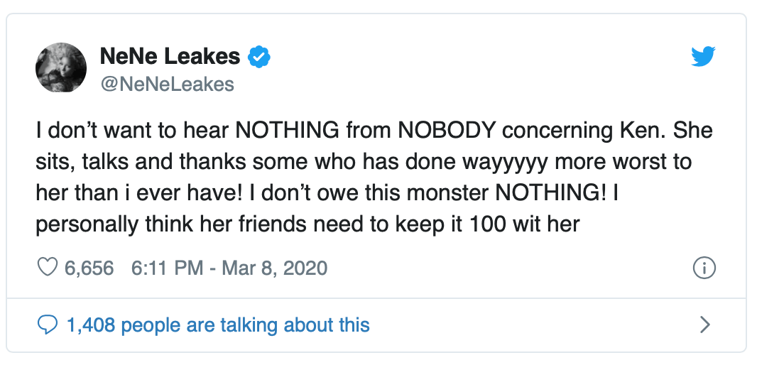 “I don’t want to hear NOTHING from NOBODY concerning Ken,” Nene wrote. “She sits, talks and thanks some who has done wayyyyy more worst to her than i ever have! I don’t owe this monster NOTHING! I personally think her friends need to keep it 100 wit her.”