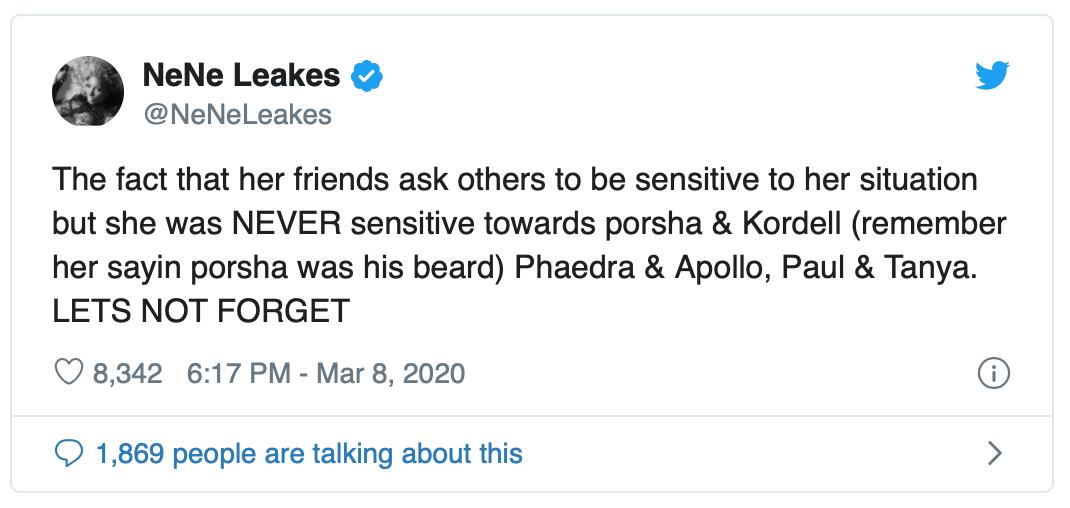 “The fact that her friends ask others to be sensitive to her situation but she was NEVER sensitive towards porsha & Kordell (remember her sayin porsha was his beard) Phaedra & Apollo, Paul & Tanya. LETS NOT FORGET”