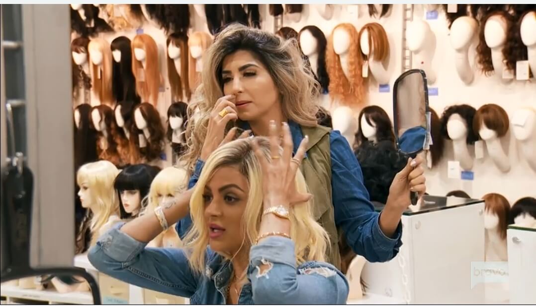 Destiney heads to a wig shop to get a new family member. She blames her love of fake hair on her childhood. No, it didn’t make sense to me either. GG meets up with her and doles out fake cheek kisses. GG puts on a blonde wig, then a pink one, then a short Kris Kardashian helmet. None of them look good on her.