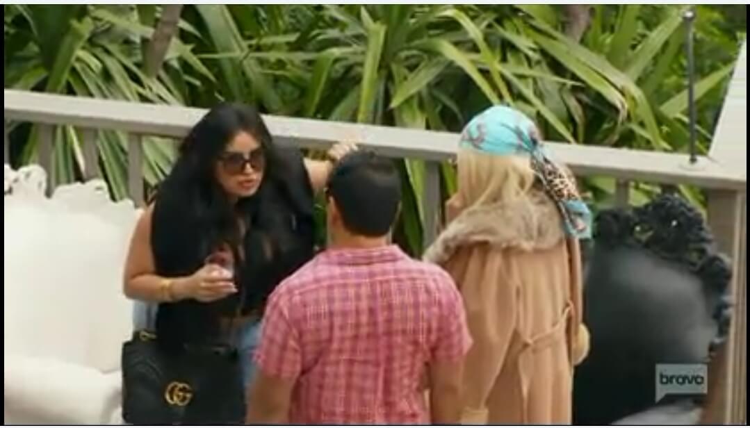 Reza wonders if maybe he got it wrong. Could MJ be innocent? There’s a slim possibility, so he goes back inside to confront her. MJ tells him to get away from her. He keeps asking if she’s embarrassed. She calls him disgusting. Then she throws a drink on Reza’s face. They call each other foul names. She says he and Adam are cheaters, claiming they go to bath houses. He screams that MJ had ten abortions, that’s why her uterus exploded. Mike yells at both of them to stop, as does Destiney.