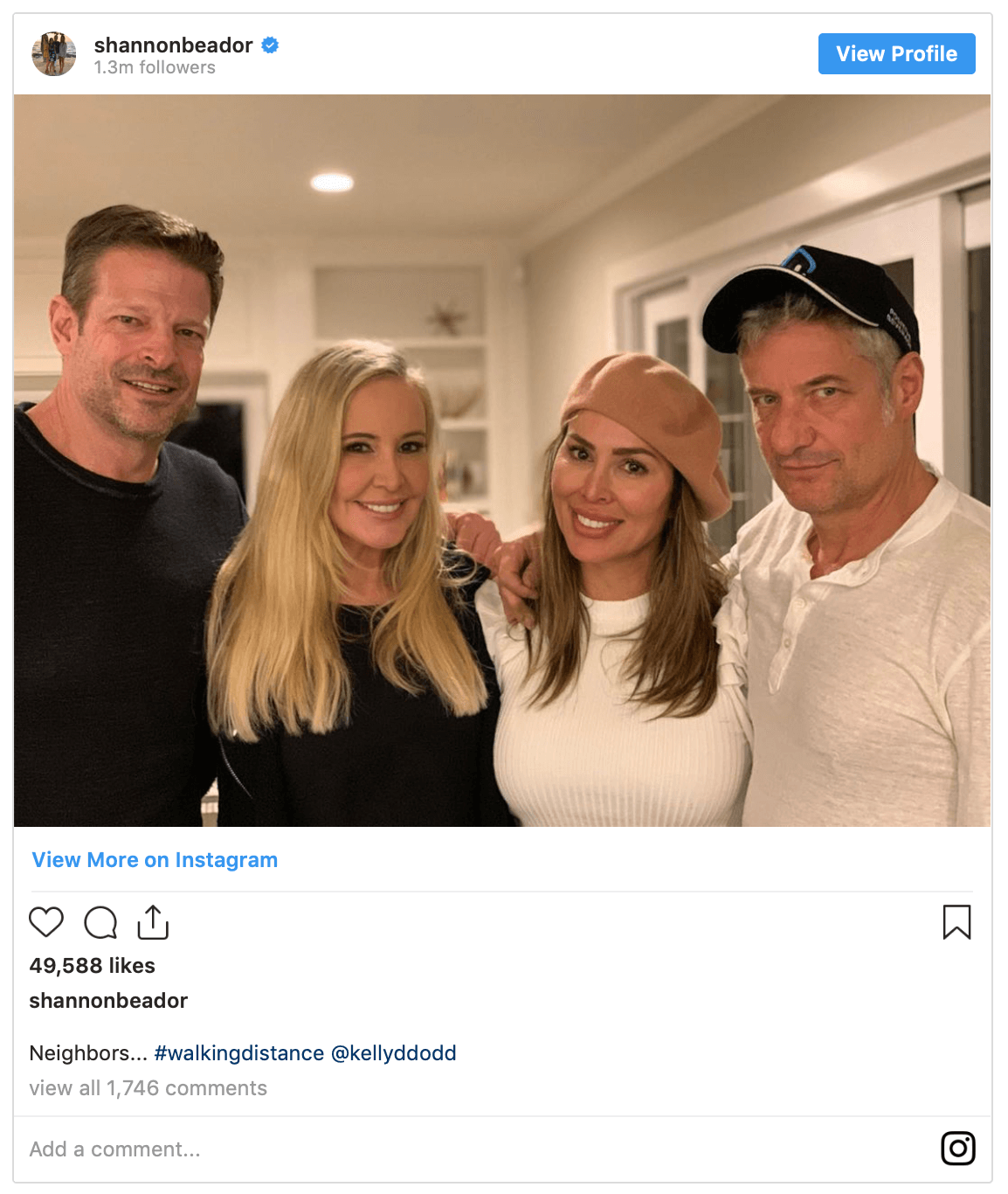 “Neighbors … #walkingdistance,” Shannon captioned the Instagram photo of Shannon, Kelly, Shannon’s beau, John Jannsen, and Kelly’s fiance, Rick Leventhal.