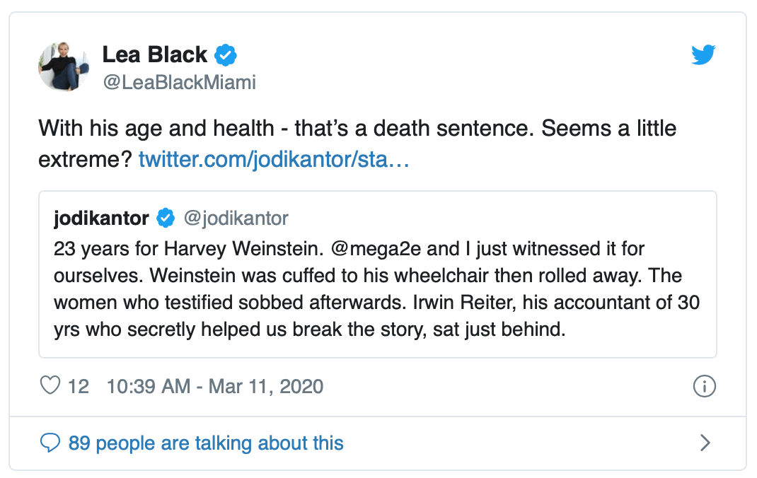After Harvey Weinstein’s sentencing, Lea Black, took to Twitter to show some sympathy for the disgraced Hollywood titan. She wrote, “With his age and health – that’s a death sentence. Seems a little extreme?” — when responding to a tweet reporting Harvey Weinstein’s 23-year prison sentence.