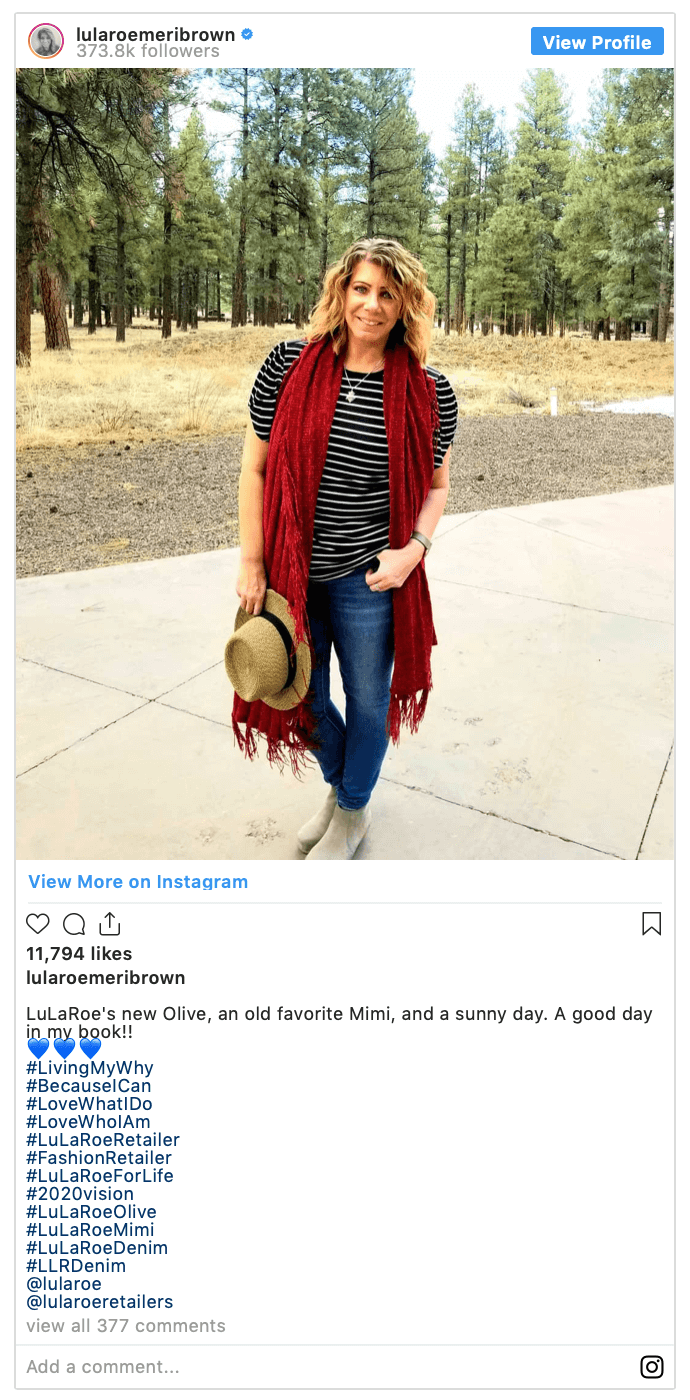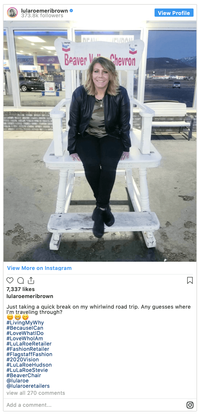 “Fake af — @lularoemeribrown what filter do you use to make yourself look trim?” one follower wrote.