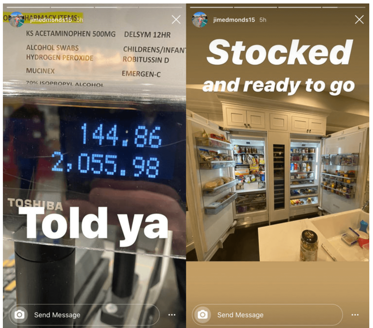 In another photo, Jim Edmonds offered a peek inside his all-white kitchen, where the refrigerator doors were flung open. “Stocked and ready to go,” he captioned the pic.