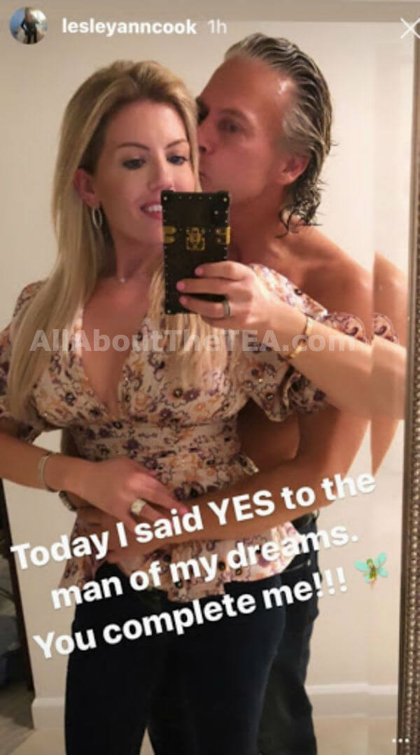 Lesley Cook announced the news via Instagram where she shared a close-up of her engagement ring with a shirtless David Beador standing behind her in an embrace. “Looking forward to eternity with my love. I LOVE YOU LOVE!!!” She captioned the pic.