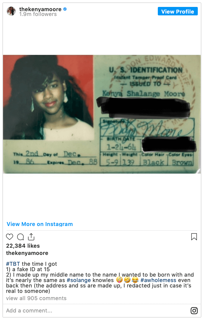 Kenya Moore shared a throwback photo on Thursday — the Real Housewives of Atlanta star posting a click of a fake ID she used as a teenager.