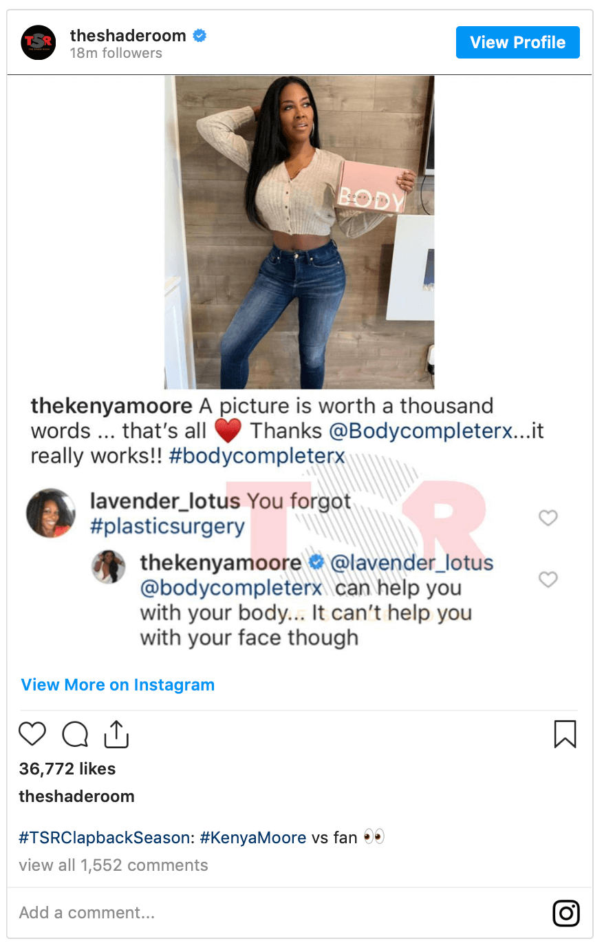 Viewers have been calling out Kenya Moore’s prominent backside for years — and most believe that she’s been given a surgical boost in the buttocks department.