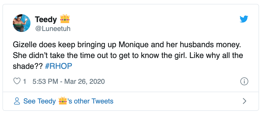 Gizelle Bryant kicked off the preview party by loftily shading Monique Samuels — implying that she was to blame for inciting a physical altercation with Candiace Dillard.