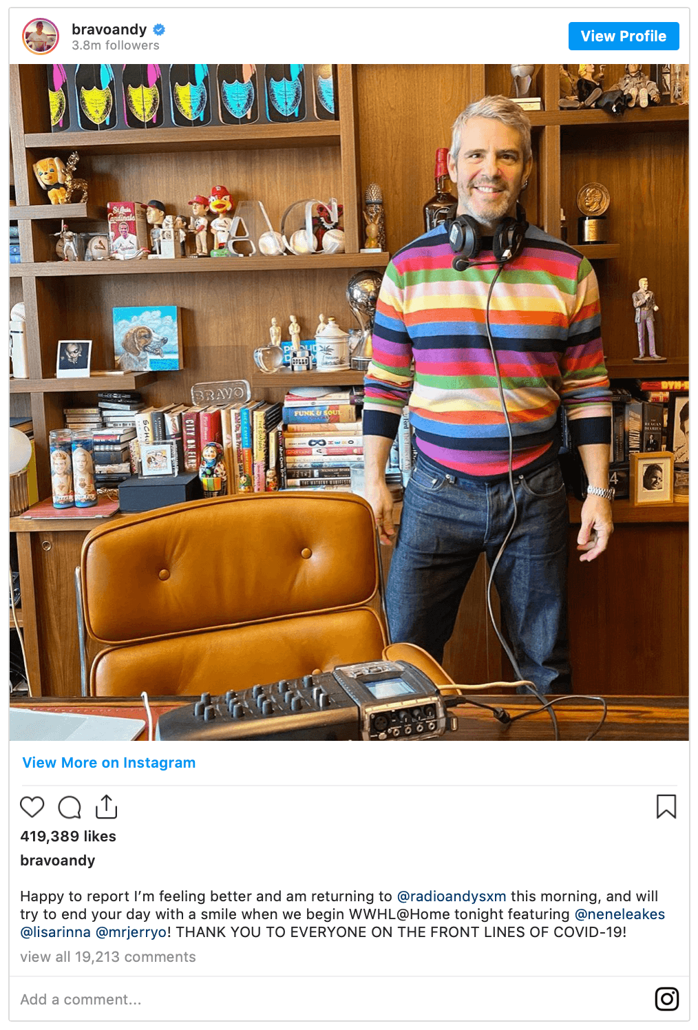 “Happy to report I’m feeling better and am returning to @radioandysxm this morning, and will try to end your day with a smile when we begin WWHL@Home tonight featuring @neneleakes @lisarinna @mrjerryo! THANK YOU TO EVERYONE ON THE FRONT LINES OF COVID-19!”