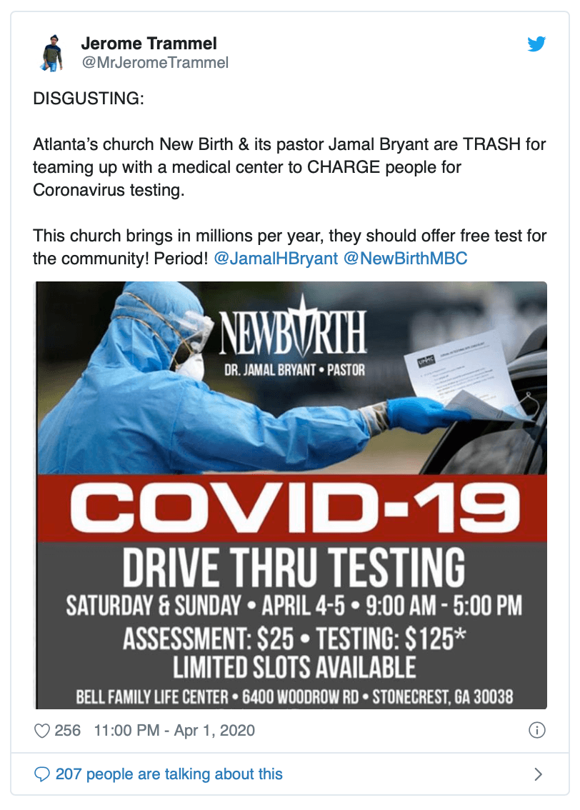 Jamal Bryant’s church, New Birth Missionary Baptist Church, is facing backlash after a plan was set in place to charge the public for coronavirus testing.