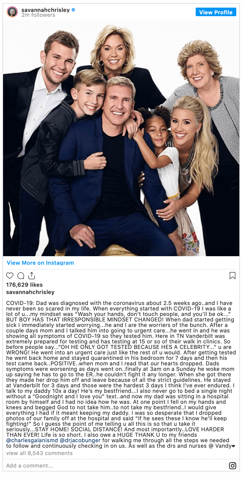 Todd Chrisley’s daughter, Savannah Chrisley, took to Instagram to discuss her dad’s diagnosis and hospitalization. She wrote, “I have never been so scared in my life,” Savannah wrote, adding, “When dad started getting sick I immediately started worrying… he and I are the worriers of the bunch. After a couple days mom and I talked him into going to urgent care… he went in and he was showing all symptoms of COVID-19 so they tested him.”