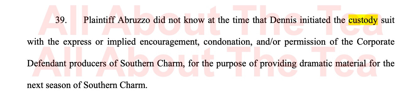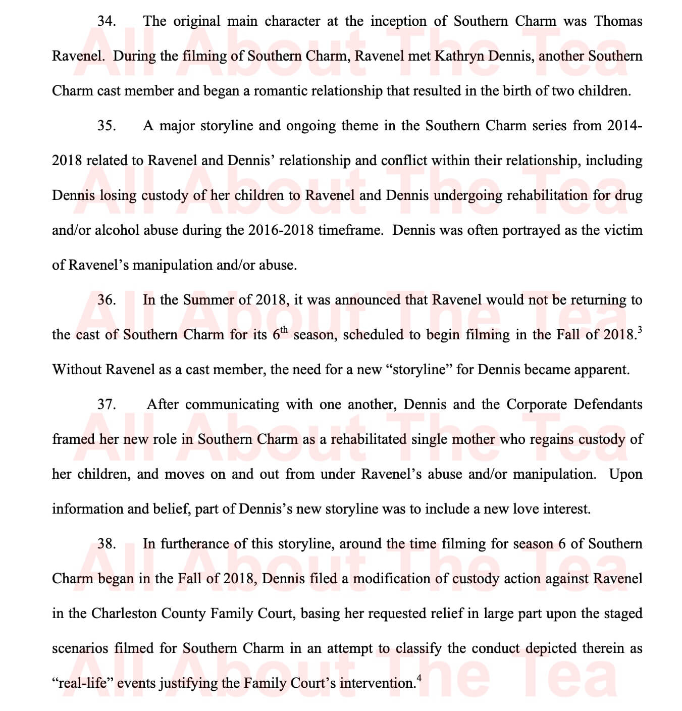 “In furtherance of this storyline, around the time of filming for Season 6 of Southern Charm began in the Fall of 2018, Dennis filed a modification of custody action against Ravenel in the Charleston County Family Court, basing her requested relief in large part upon the staged scenarios filmed for Southern Charm in an attempt to classify the conduct depicted therein as “real life” events justifying the Family Court’s intervention,” the doc reads.