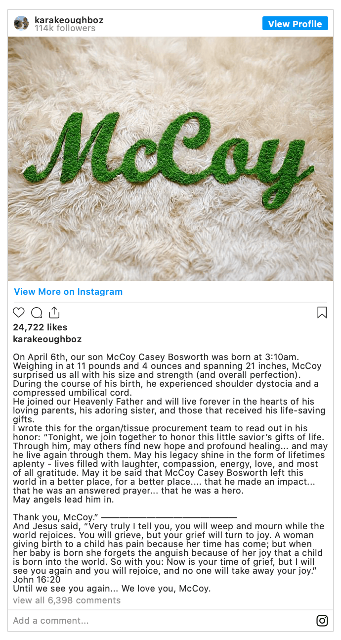“On April 6th our son McCoy Casey Bosworth was born at 3:10 am. Weighing in at 11 pounds and 4 ounces and spanning 21 inches, McCoy surprised us all with his size and strength (and overall perfection). During the course of his birth, he experienced shoulder dystocia and a compressed umbilical cord. He joined our Heavenly Father and will live forever in the hearts of his loving parents his adoring sister and those that received his life-saving gifts.”