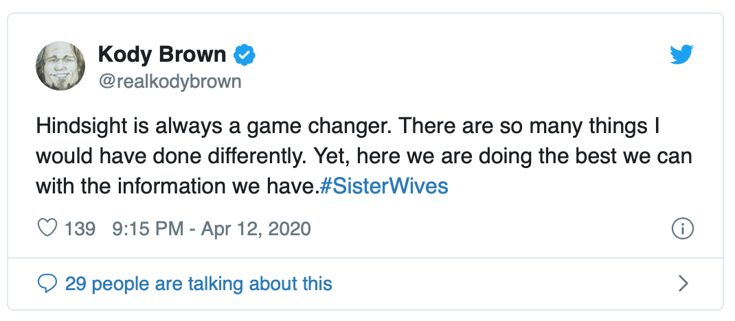 “Hindsight is always a game changer. There are so many things I would have done differently. Yet, here we are doing the best we can with the information we have,” Kody wrote.