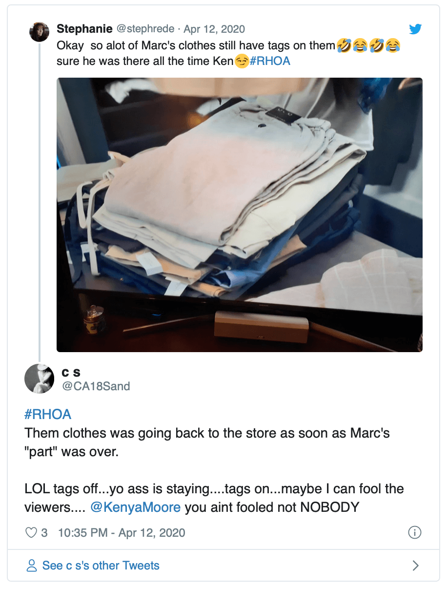 Kenya Moore was seen moodily clearing Marc Daly’s clothes from her closet — but fans took note of the attached tags on almost every garment. Viewers have been slamming the reality star on social media for staging the scene, with a fake wardrobe. Rented or purchased for a quick return — Kenya Moore was busted, and so were her closet props.