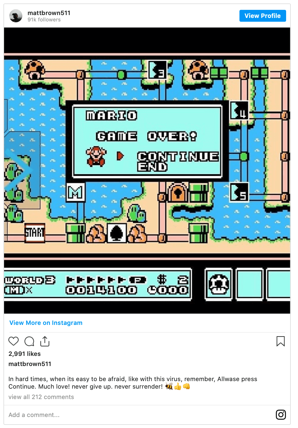 Matt Brown captioned a Mario Kart screen grab, “In hard times, when its easy to be afraid, remember, Allwase press Continue. (sic) Much love! never give up. never surrender!”