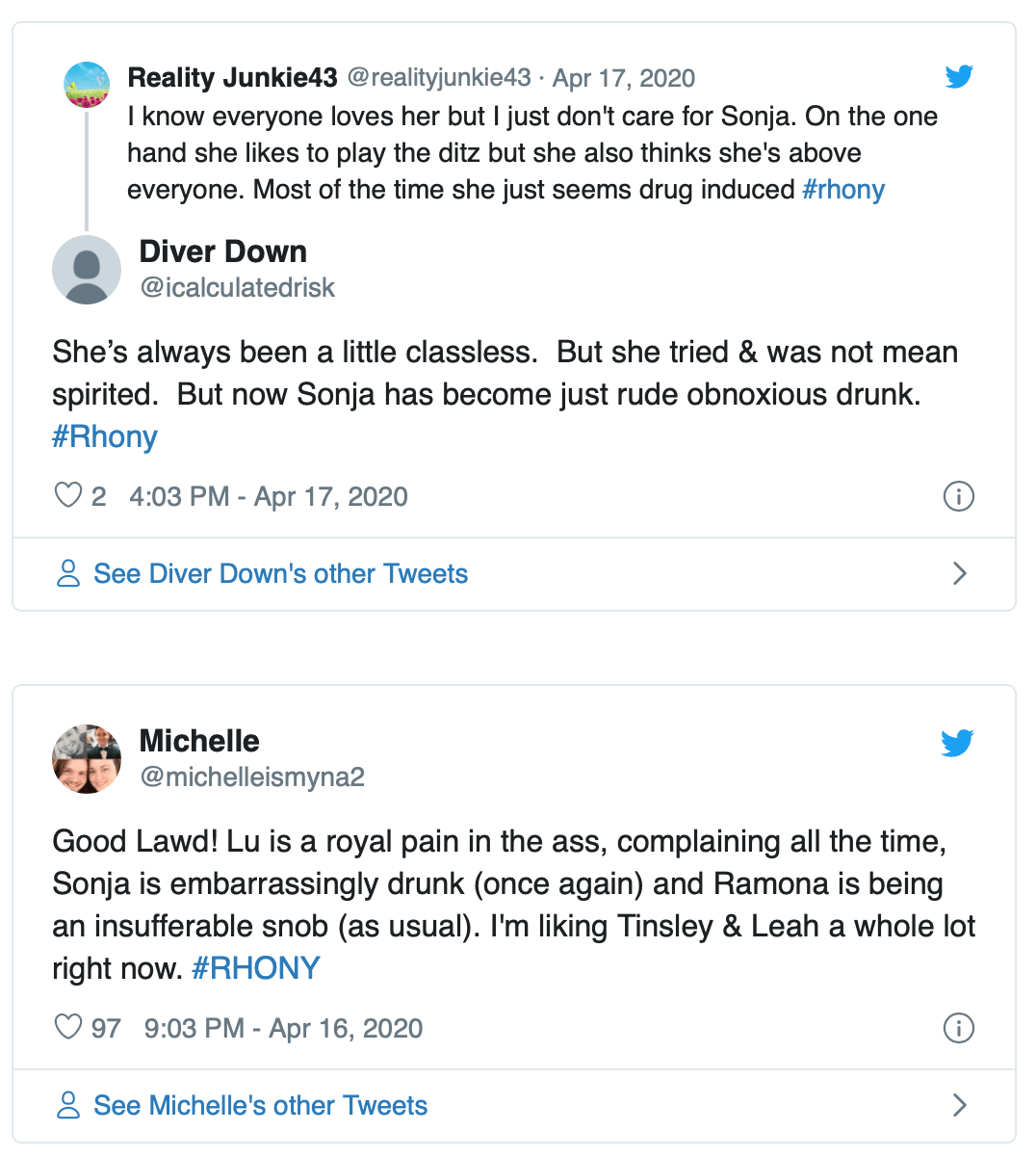 Sonja Morgan’s plastered party performance had fans chattering on Twitter — dragging the reality star for getting sloppy drunk at a party/open house hosted by an acquaintance of Ramona Singer’s, developer, Joe Farrell.