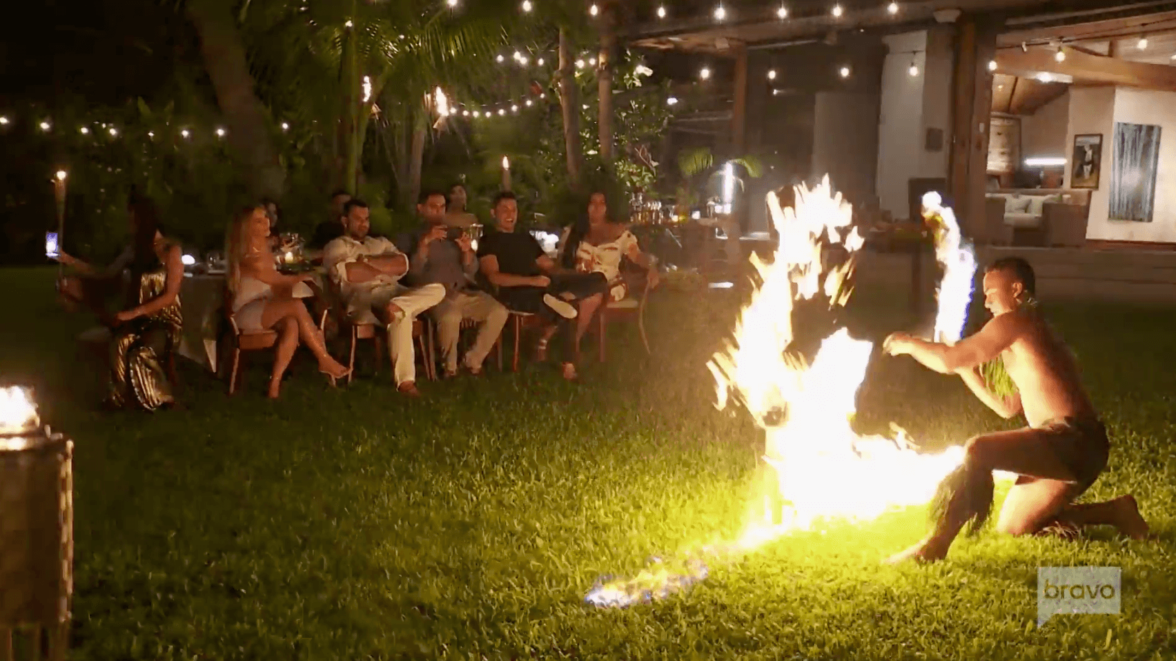 They watch the fire throwing show, and GG is high, so she’s freaking out. She hides behind the table to stay safe—even though she’s a few yards from the fire baton twirler.