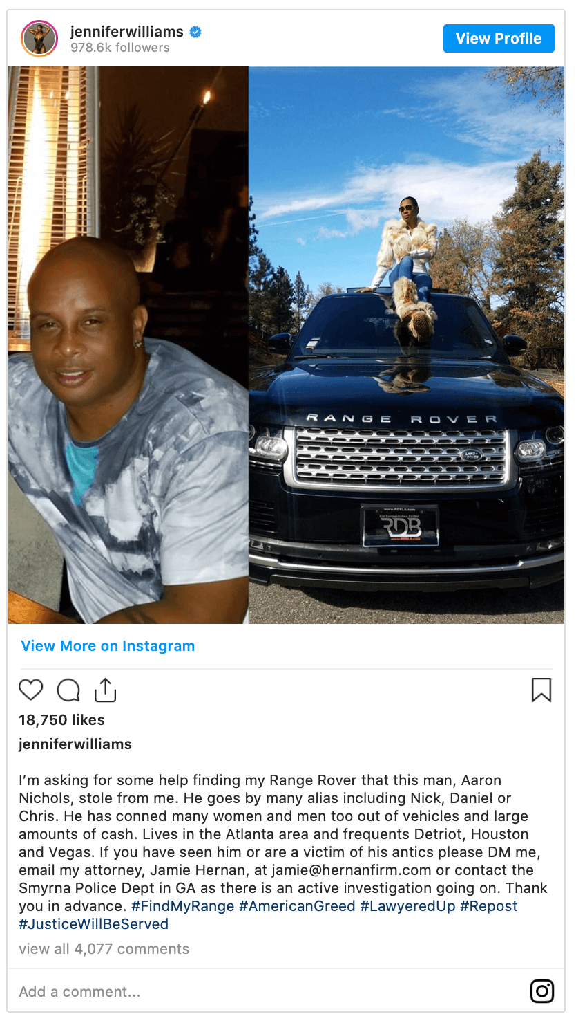 Basketball Wives star Jennifer Williams, took to Instagram late last week, to hunt down a man who she claimed conned her and stole her Range Rover.